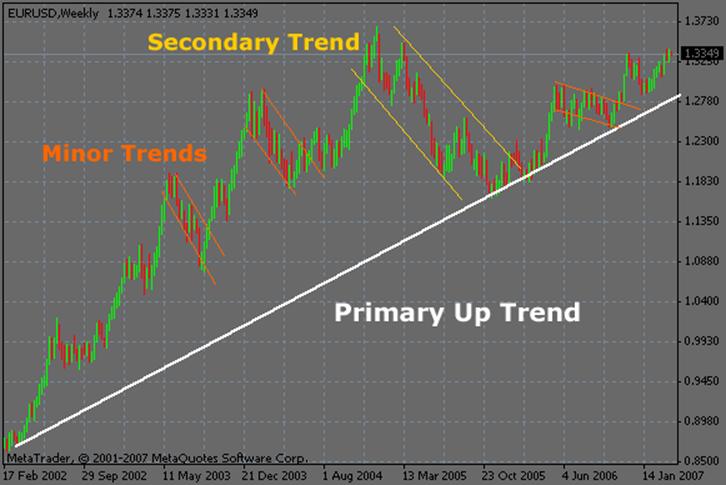 Dow Theory example illustrating primary, secondary, and minor trends that form the overall market direction.