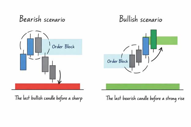 The chart showing bullish and bearish order blocks as the last opposite candles before a strong directional move. The highlighted zones mark areas where buying or selling activity was left unfinished, which often causes price to react when it revisits these levels.